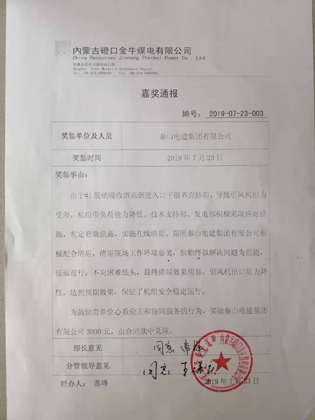 由于#1脱硫吸收塔原烟道入口干湿界面结垢,导致引风机出力受限,机组带负荷能力降低。技术支持部、发电部积极采取应对措施,制定有限措施,实施在线清垢。期间泰山电建集团有限公司积极配合清垢,清垢现场工作环境恶劣,但始终以解决问题为前提,砥砺前行,不向困难低头,最终清垢效果明显,引风机出口阻力降低,达到预期效果,保证了机组安全稳定运行。