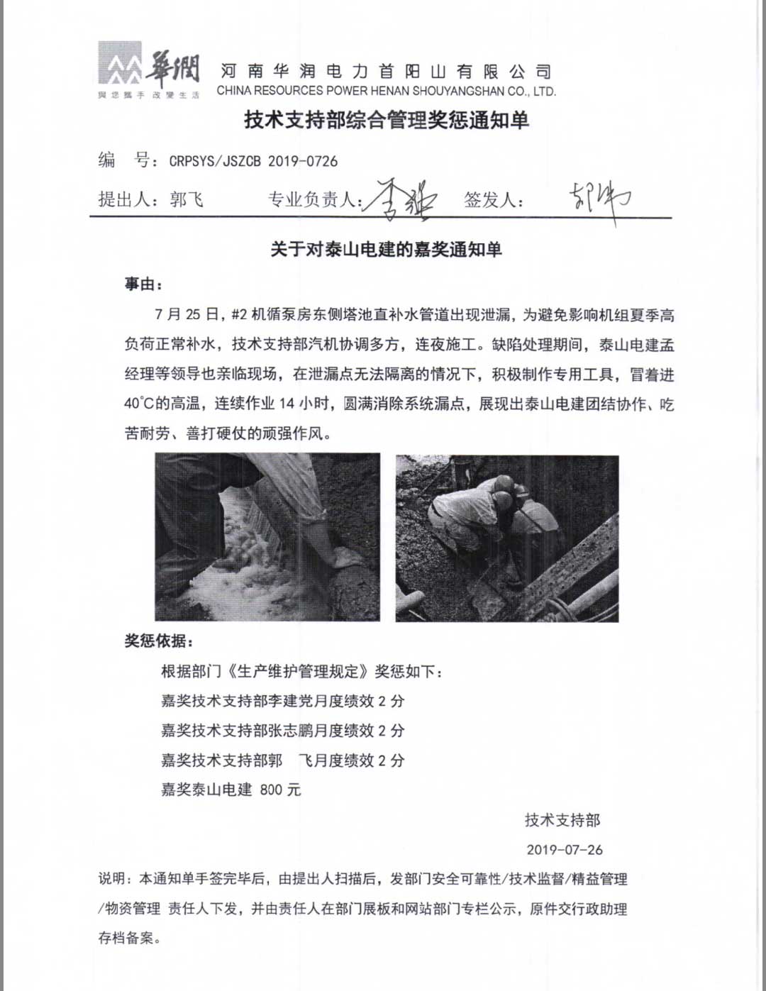 7月25日,#2机循泵房东侧塔池直补水管道出现泄漏,为避免影响机组夏季高负荷正常补水,技术支持部汽机协调多方,连夜施工。缺陷处理期间,泰山电建孟经理等领导也亲临现场,在泄漏点无法隔离的情况下,积极制作专用工具,冒着近40℃的高温,连续作业14小时,圆满消除系统漏点,展现出泰山电建团结协作、吃苦耐劳、善打硬仗的顽强作风。